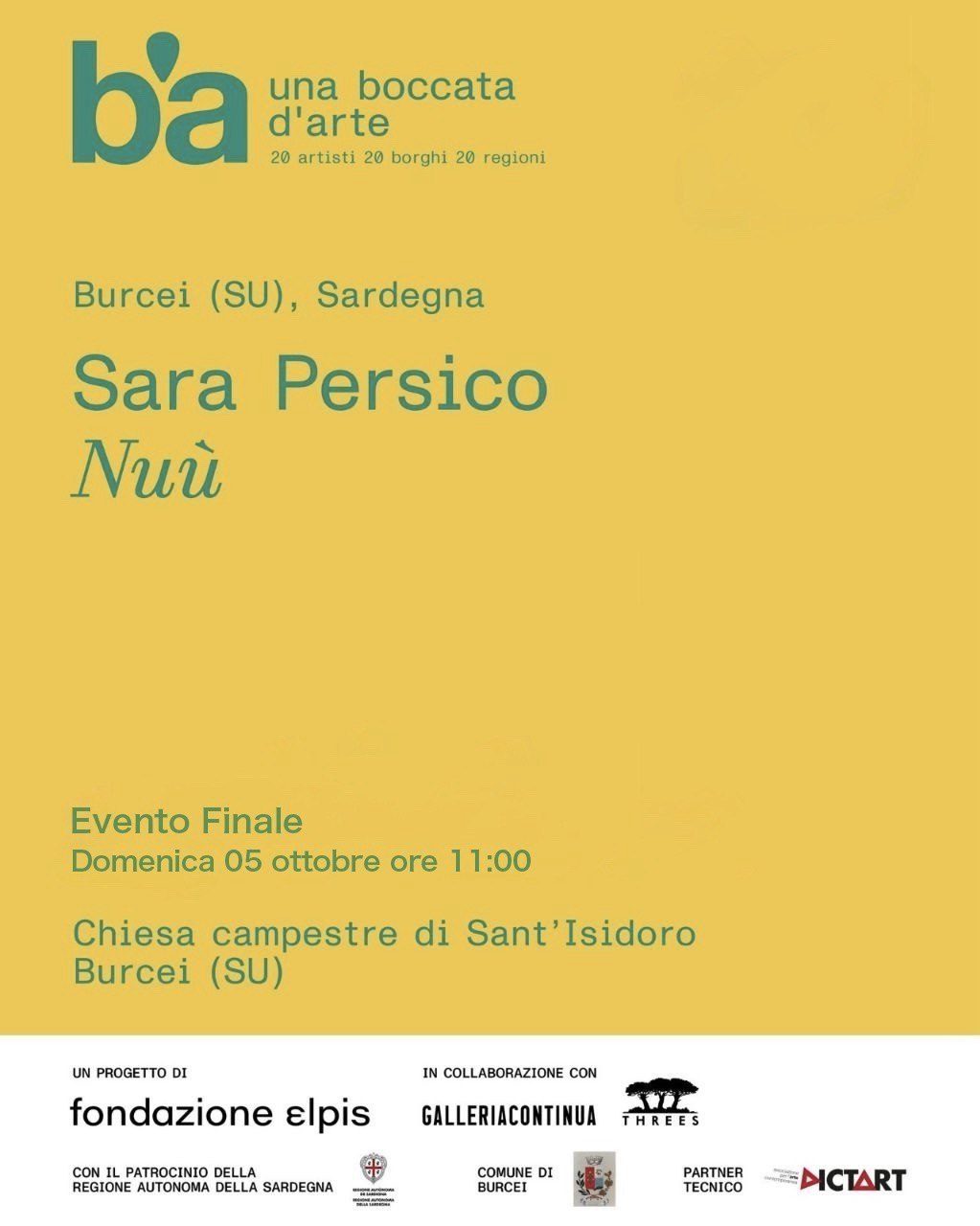 Domenica 5 ottobre 2025, alle ore 11:00/11.30, presso la chiesetta di Sant’Isidoro in Burcei, si svolgerà la manifestazione conclusiva del progetto diffuso d’arte contemporanea ideato da Fondazione Elpis, ‘Una Boccata d’Arte 20 artisti, 20 borghi, 20 regioni - sesta edizione’. Sono previste le performance degli artisti Sara Persico e Fabio Talloru e un piccolo buffet di saluto. Ingresso libero e aperto a tutti.